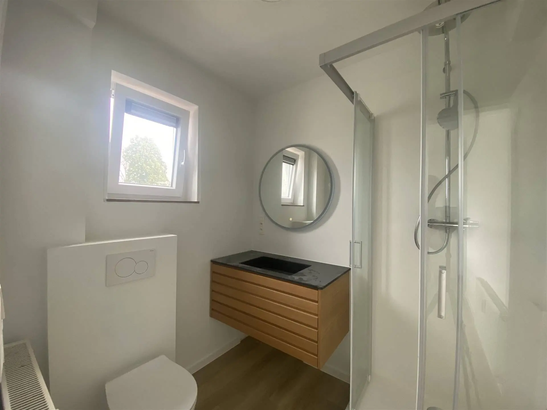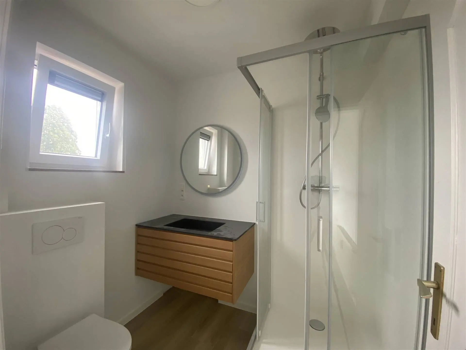 Un grand hall d'entrée pour amener directement dans le spacieux living qui vous offre une vue en hauteur sur la charmante ville de Ciney. Vous retrouverez dans celui-ci un meuble TV, une