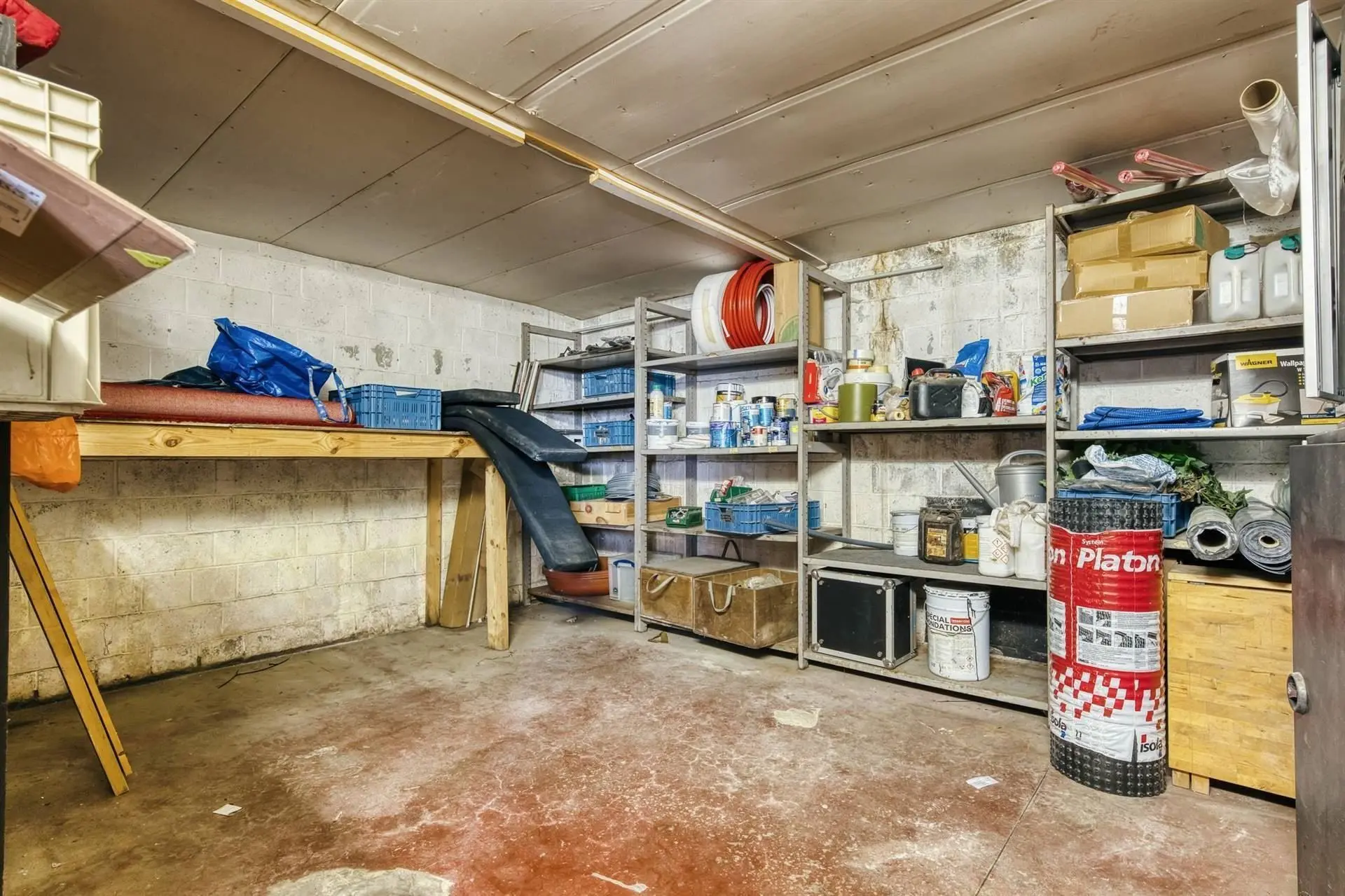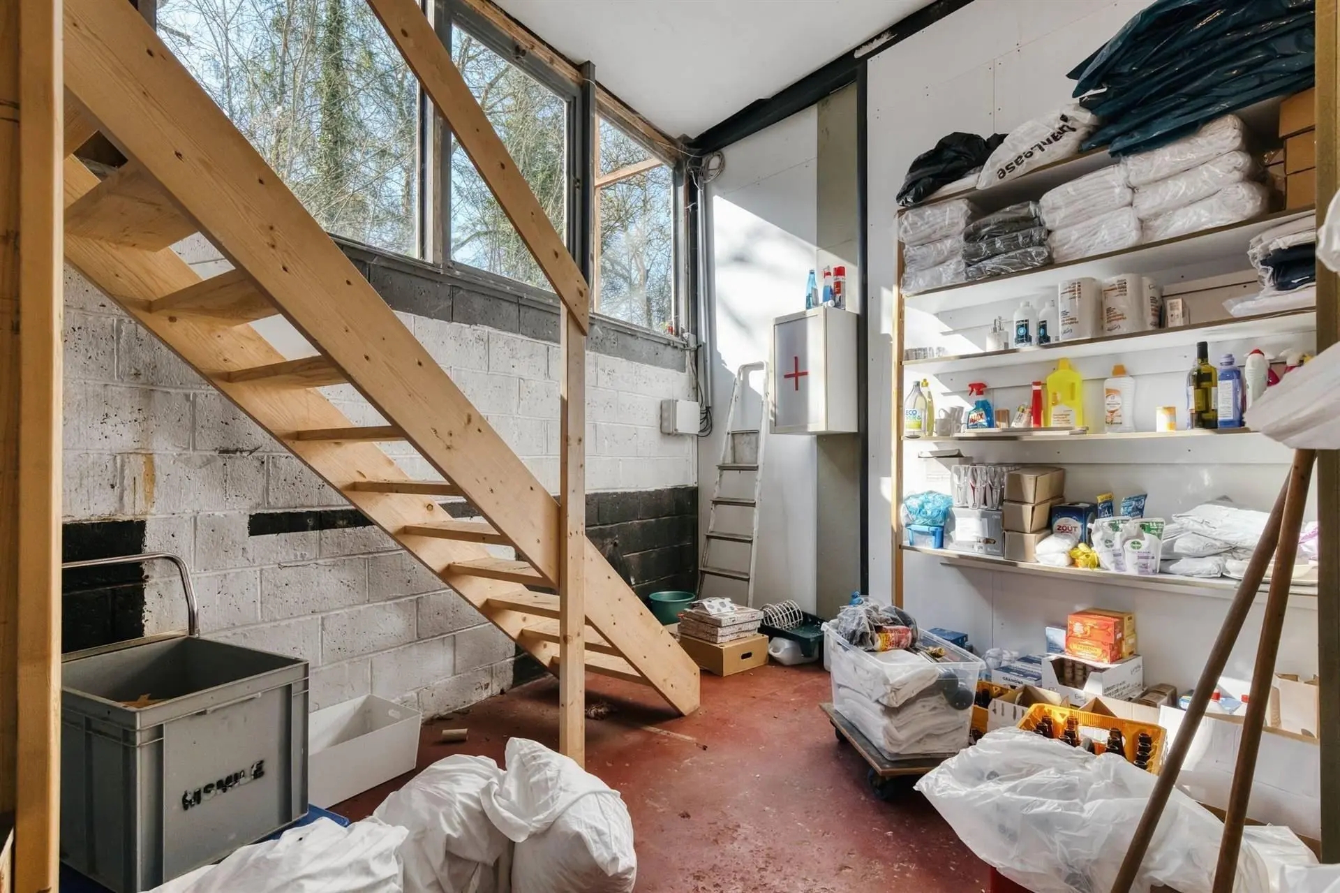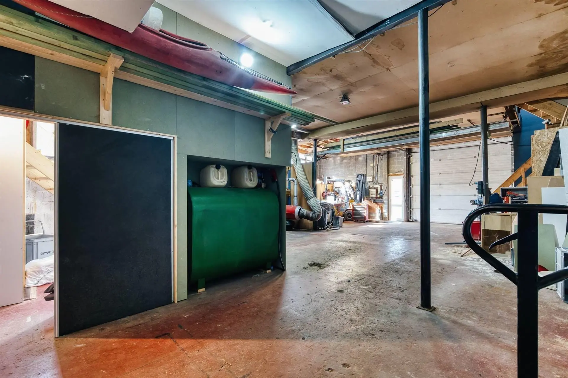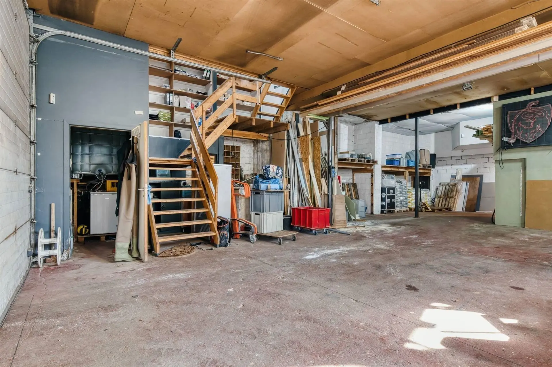 Au rez-de-chaussée : un entrepôt de 170m², buanderie et local technique et espaces de stockage avec grande porte sectionnelle.