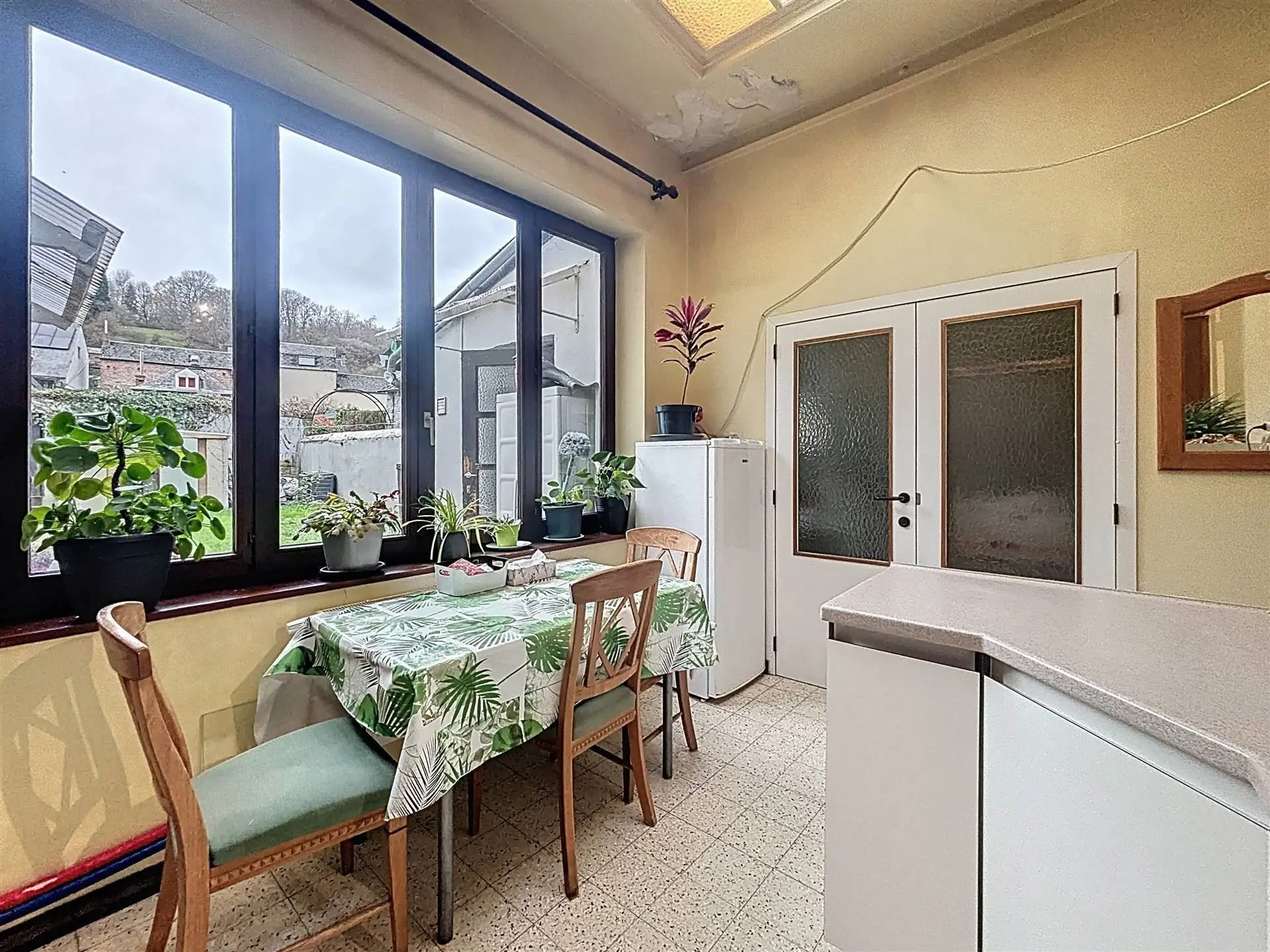 À l'intérieur, le bien dispose de trois chambres spacieuses, permettant d'accueillir confortablement une famille. La cuisine est aménagée avec équipements modernes. La salle de bain est fonctionnelle et prête à l'emploi. Les grandes fenêtres offrent des vues remarquables, notamment sur la Meuse et ses paysages vallonnés.