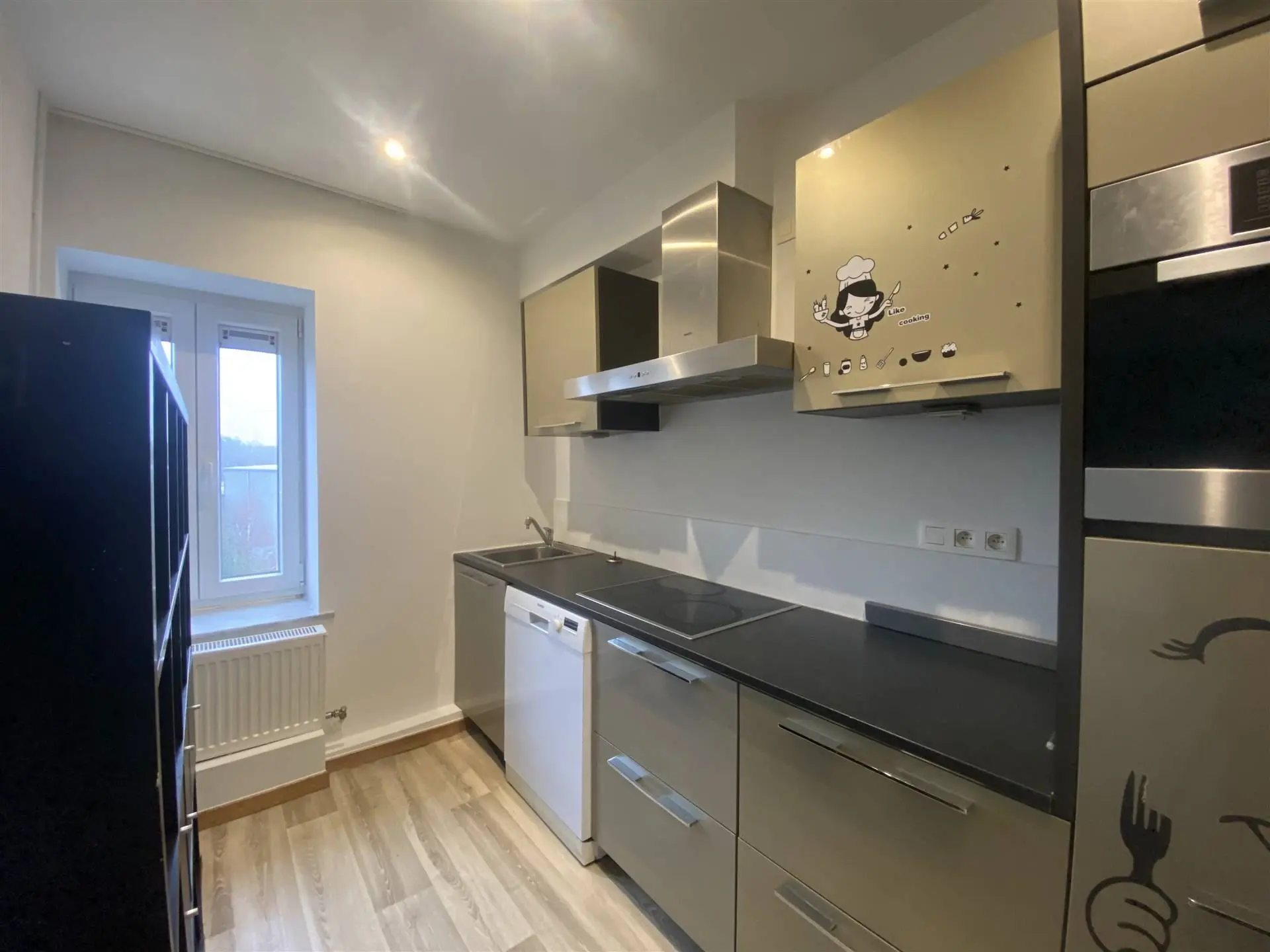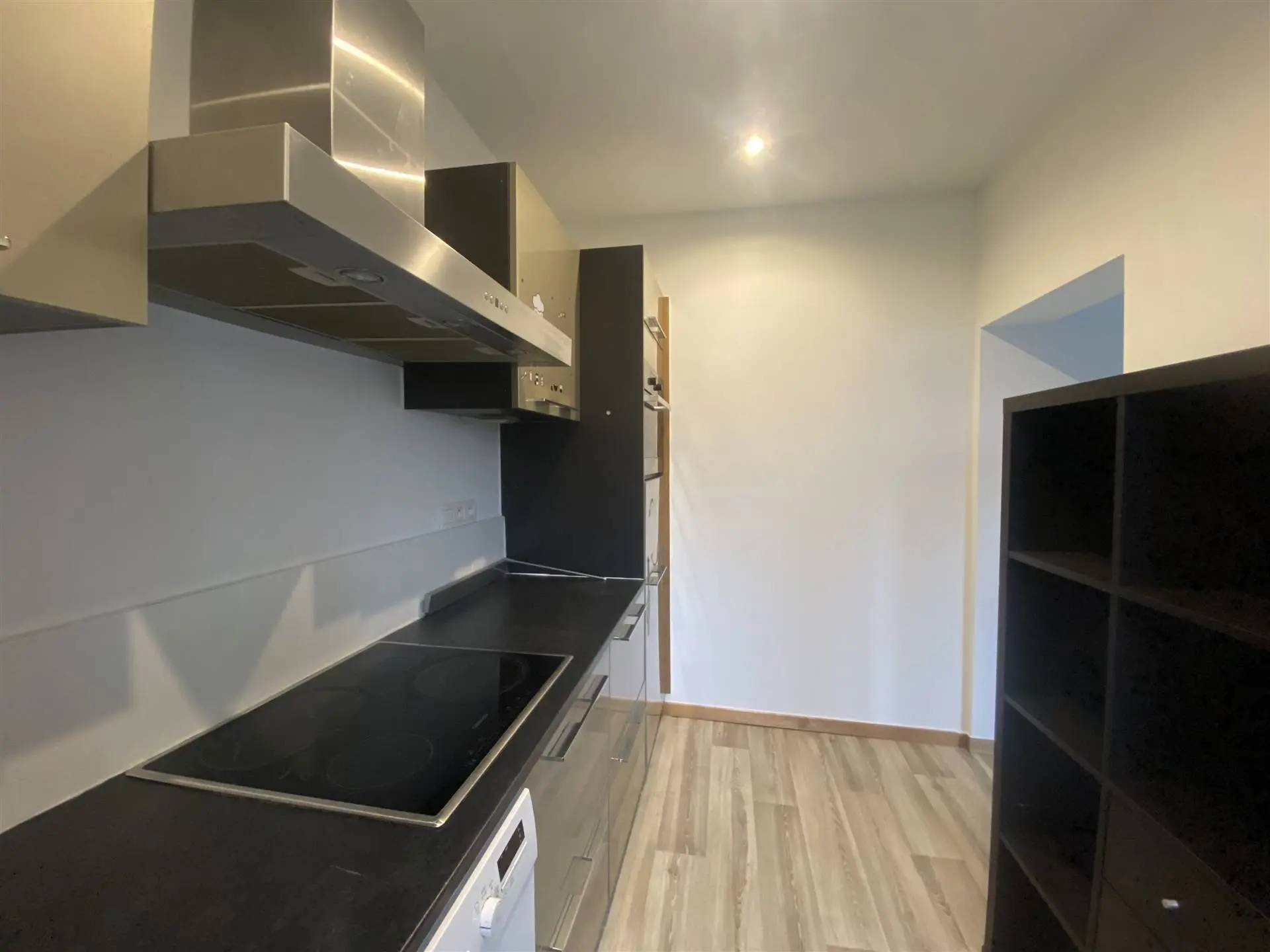 La cuisine équipée dispose d'un mobilier moderne avec des appareils électroménagers intégrés, dont un four et une plaque de cuisson. Elle offre un espace pratique