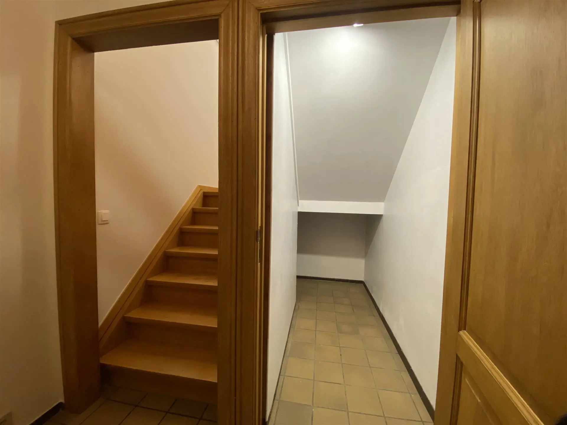 Vous retrouver un bel escalier vous menant directement au premier étage qui vous offre un bel espace de vie avec une cuisine ouverte équipée, une première chambre ainsi qu'une salle de douche avec un bain et un WC séparé.