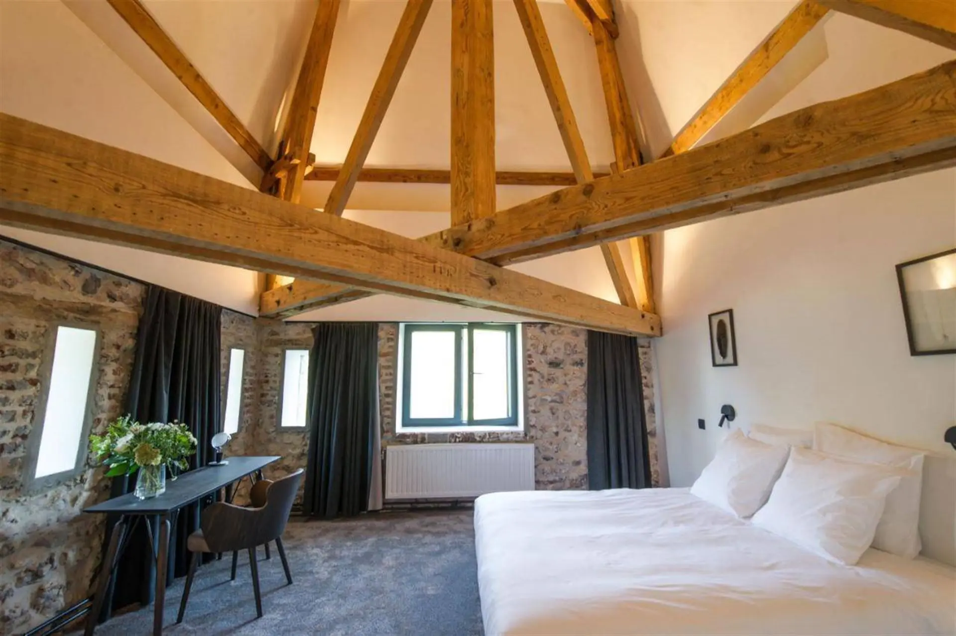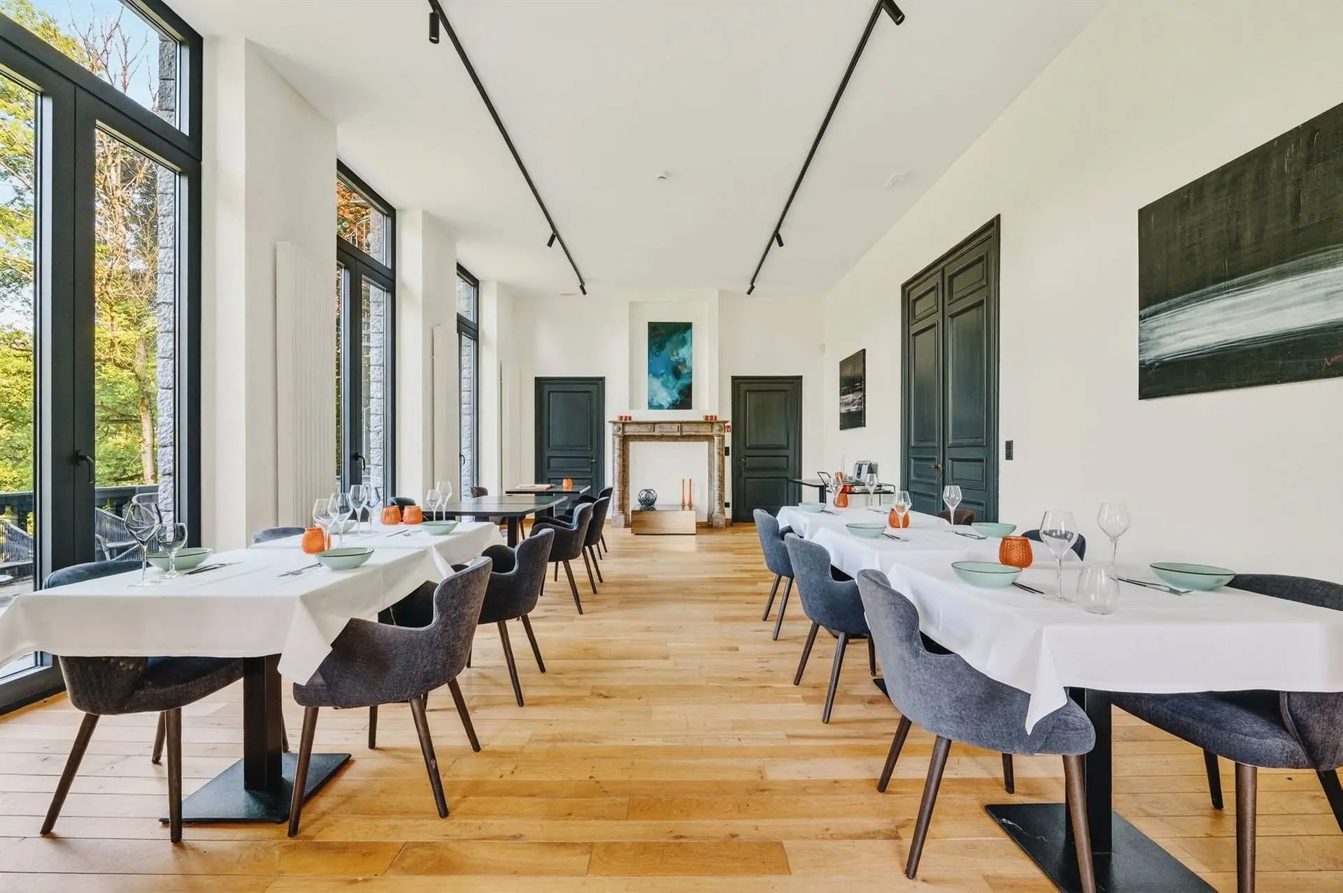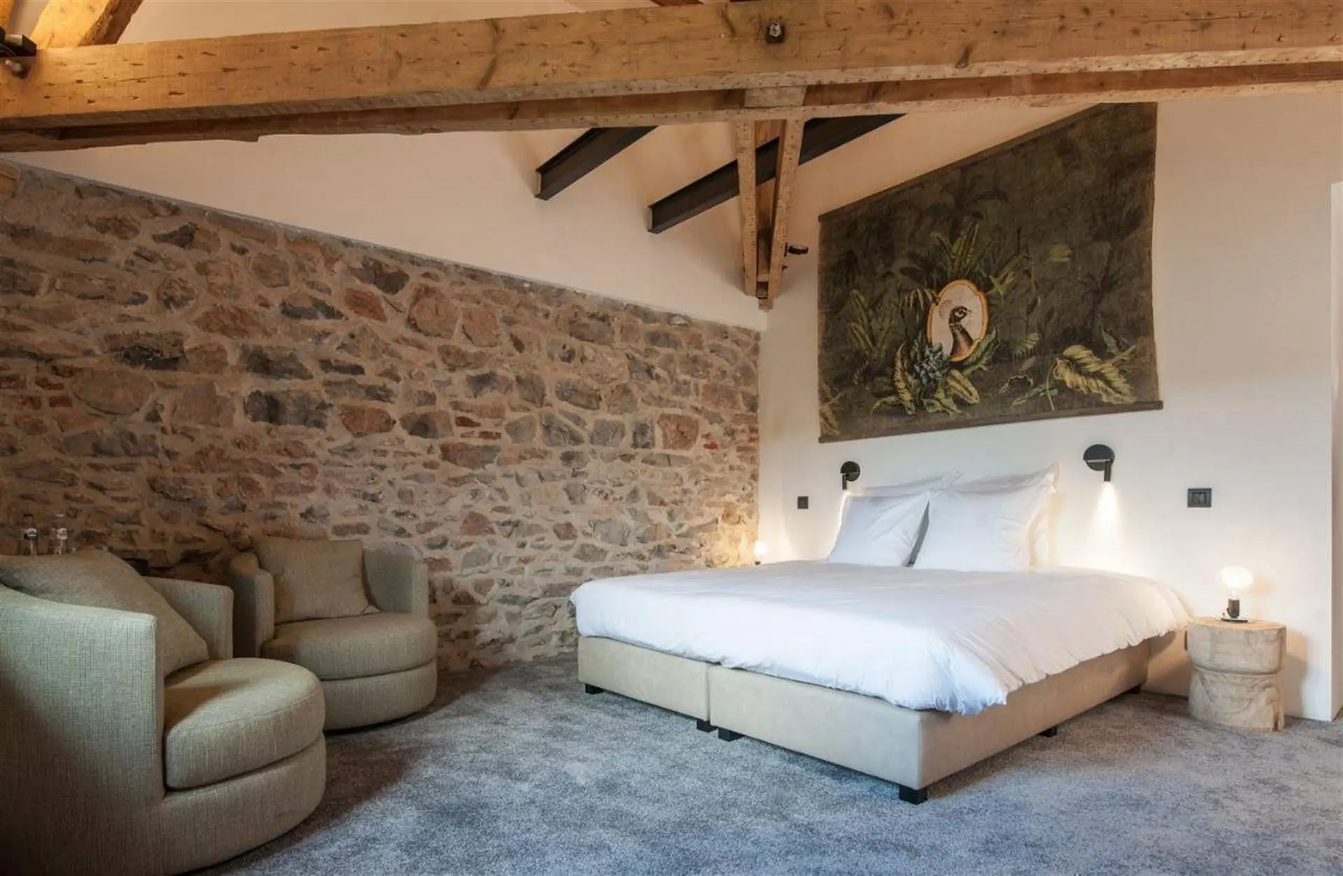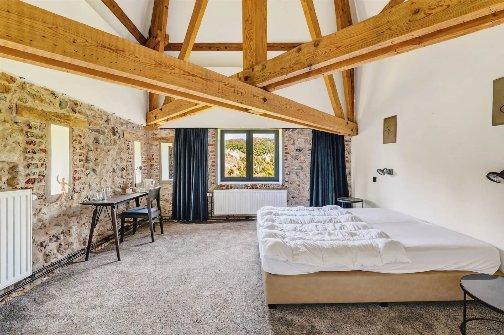 À l’intérieur, la pierre bleue, symbole de raffinement, dialogue harmonieusement avec les fauteuils Vegas et les chaises bar Monterey de la marque belge Marie’s Corner, créant une ambiance à la fois chic et chaleureuse. Les douze chambres, au design résolument trendy, sont dotées de salles de bain de luxe et toutes orientées vers la Meuse, offrant une vue époustouflante qui vous transporte loin de toute agitation.
